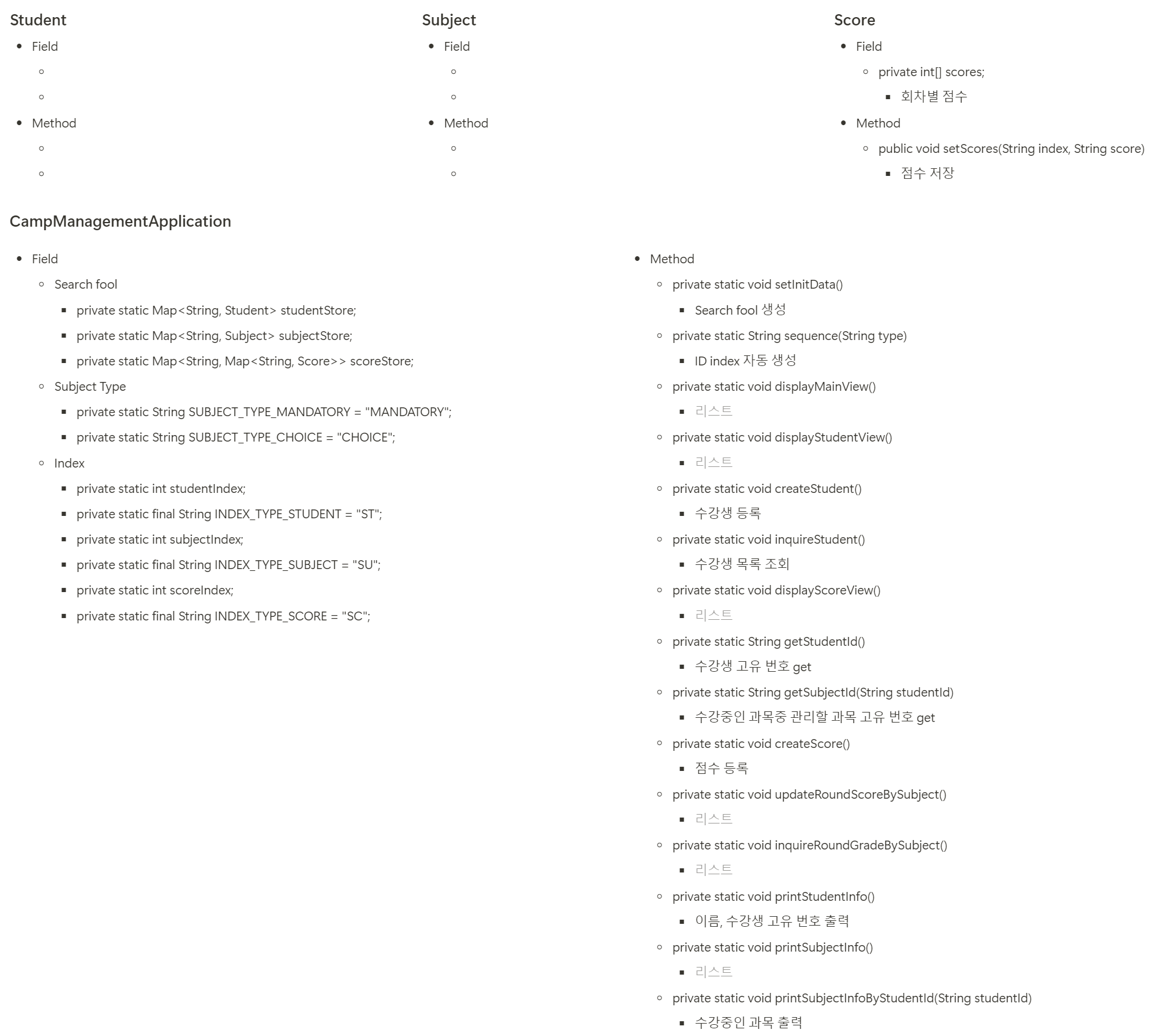 클래스별 Field와 Method를 정리했다