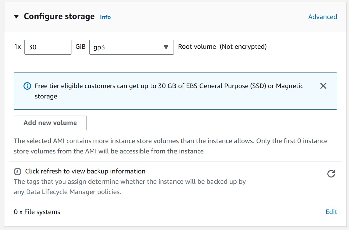 스토리지 설정은 Free tier에서 사용가능한 30으로 변경한다