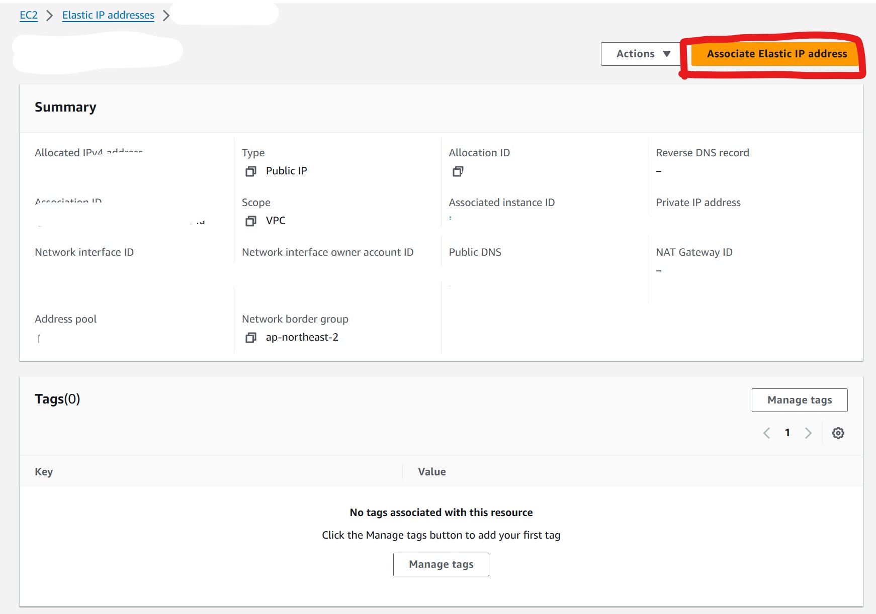 생성된 IP 상세 페이지에서 Associate Elastic IP address 클릭