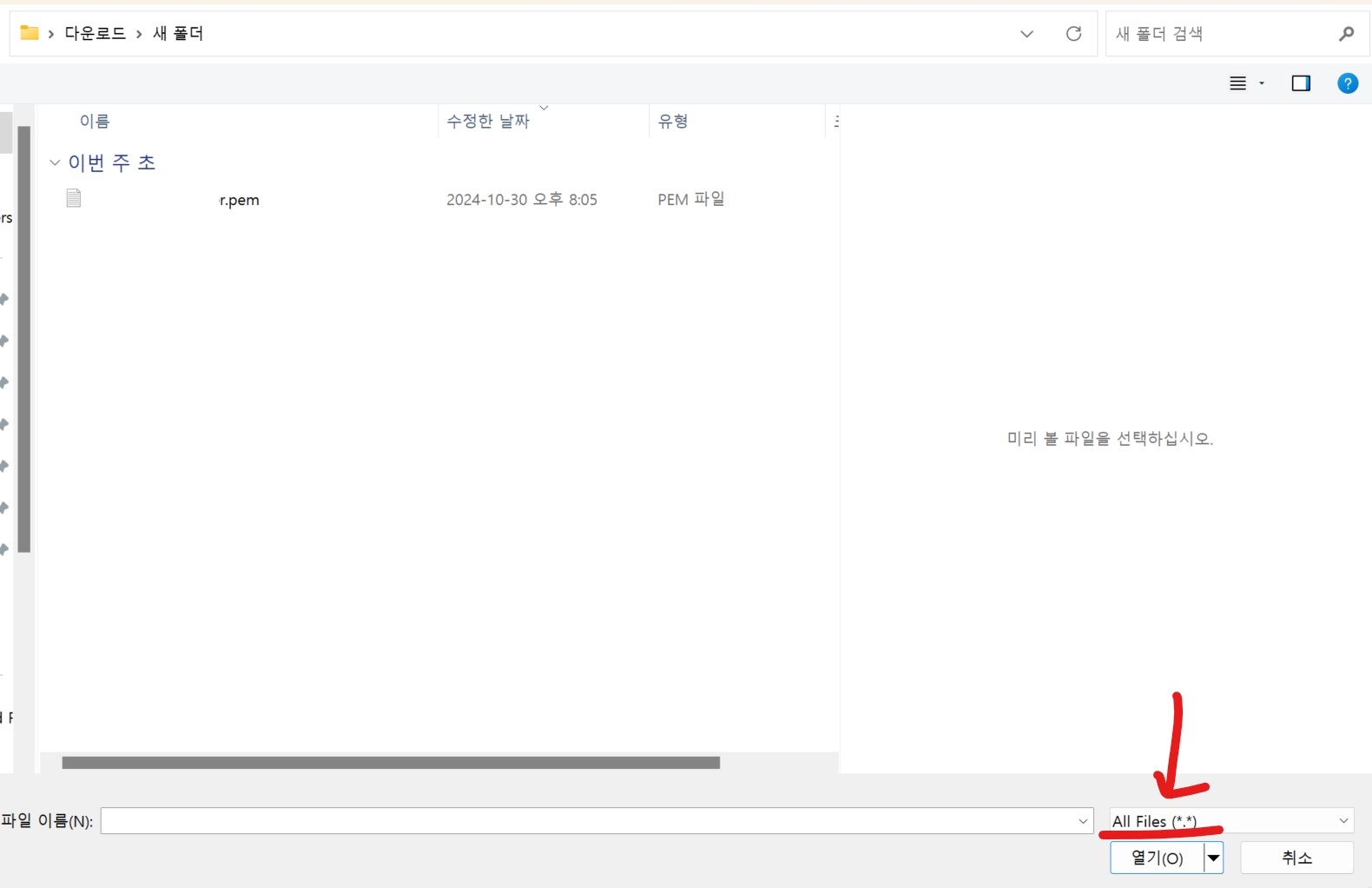 이제 보이게된 .pem 파일을 클릭하여 열기