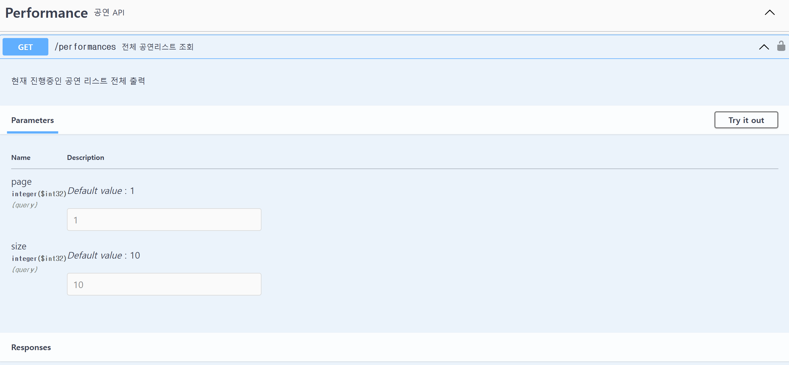 @Operation(summary = "전체 공연리스트 조회", description = "현재 진행중인 공연 리스트 전체 출력")